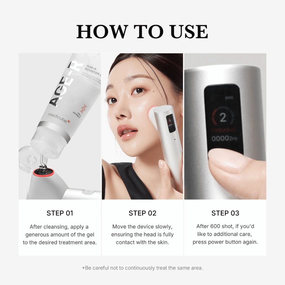 Medicube Age-R High Focus Shot v srebrni barvi s črnim aplikatorjem in rdečim obročem, zasnovan za nego kože z visoko natančnostjo.