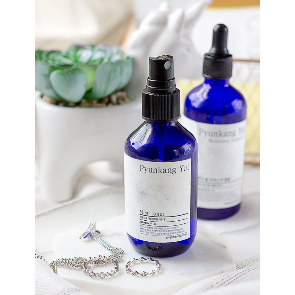 Steklenica Pyunkang Yul Mist Toner, popolna za ljubitelje tonikov, ki so prijazni do alergij, na beli podlagi.